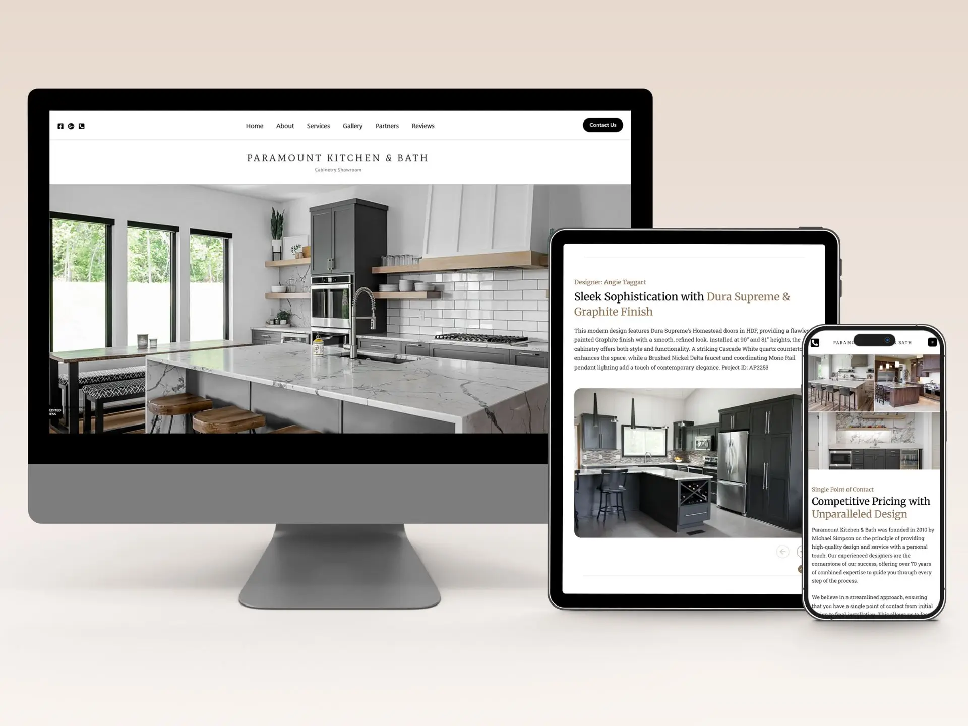 Showroom appointment requests paired with design inspiration from curated project highlights and diverse product selections.